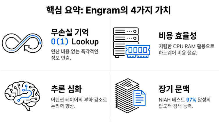 이러한 결과는 Engram이 지식 보조 도구를 넘어, 모델이 더 고차원적인 사고를 할 수 있도록 뇌의 ‘가용 에너지’를 확보해주는 혁신임을 보여줍니다.