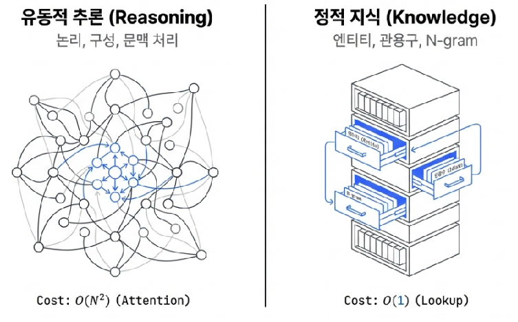 지금까지의 대규모 언어 모델(LLM)들은 복잡한 논리적 추론을 할 때나, 고정된 단순한 정적 지식을 떠올릴 때나 동일하게 무거운 신경망 연산을 수행해 왔습니다. 즉, 단순한 ‘기억(Memory)’을 매번 재구성하기 위해 막대한 GPU 자원과 컴퓨팅 파워를 낭비하는 치명적인 비효율을 안고 있었던 셈이죠.