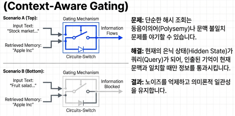 해시를 통해 지식을 빛의 속도로 찾아왔다고 해서 무턱대고 AI의 메인 사고에 섞어버릴 수는 없습니다. 방금 꺼내온 정적 메모리 ‘Apple’이 맛있는 과일인지, 아이폰을 만드는 테크 기업인지 현재 대화의 흐름(문맥)을 파악해야 하니까요.