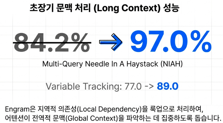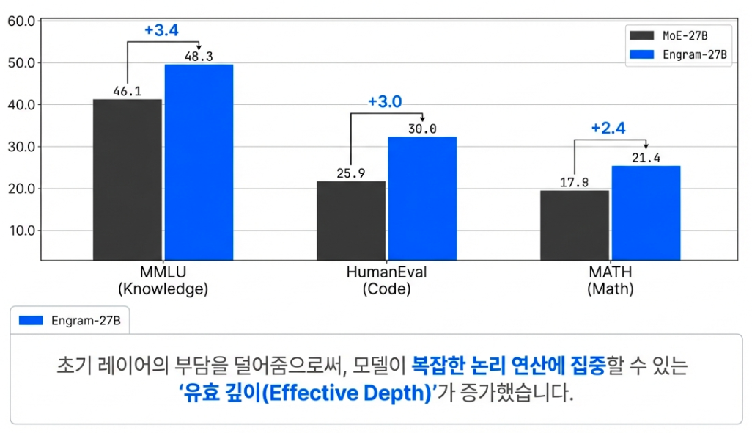 Engram은 바로 이 원리를 적용해 ‘프랑스의 수도는 파리’와 같은 고정된 지식을 무거운 연산 없이 즉각적으로 불러옵니다. 이렇게 단순 암기라는 무거운 짐을 전용 모듈에 덜어낸 덕분에, 핵심 신경망(MoE)은 오직 고도의 논리적 추론과 사고에만 에너지를 쏟을 수 있게 되었습니다. 결과적으로 모델은 절약된 연산 자원을 바탕으로 훨씬 더 깊고 복잡한 문제 해결에 온전히 집중할 수 있게 된 것입니다.