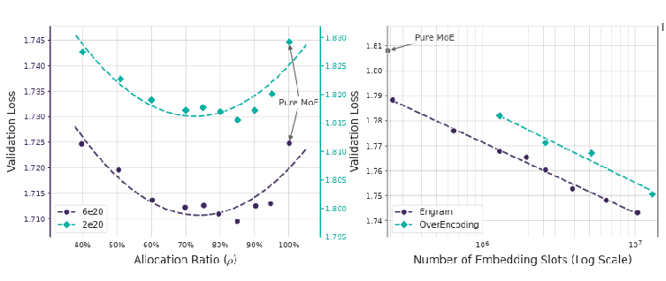 DeepSeek 연구진이 이 논문에서 증명한 또 하나의 흥미로운 사실은 ‘U자형 스케일링 법칙(U-shaped Scaling Law)’입니다. 쉽게 말해, 한정된 모델의 두뇌 용량을 ‘기억력(Engram)’과 ‘사고력(MoE 연산)’에 각각 얼마씩 투자해야 가장 똑똑한 AI가 될까?에 대한 해답을 찾은 것입니다.