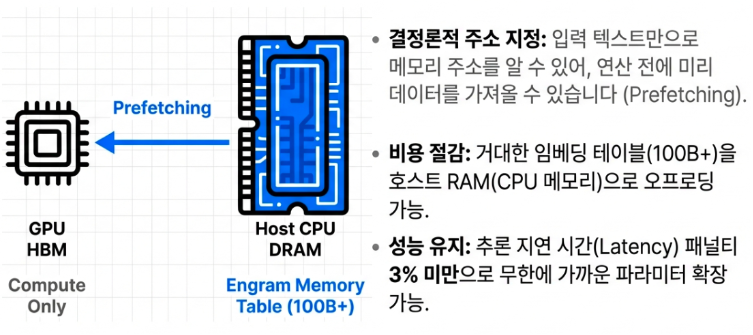앞서 설명한 Engram의 거대한 지식 사전(임베딩 테이블)은 복잡한 신경망 연산이 필요 없는 단순하고 결정론적인 해시(Hash) 구조를 띠고 있습니다. 따라서 굳이 품귀 현상을 빚고 있는 초고가 GPU의 VRAM에 이 방대한 사전을 꾸역꾸역 올려둘 필요가 없습니다.