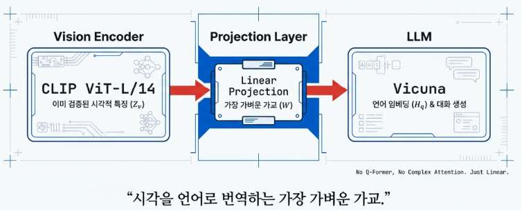 LLaVA의 설계 철학은 복잡한 시스템을 구축하기보다 ‘구조적 단순함’과 ‘결합의 효율성’에 집중하는 데 있습니다. 이를 위해 서로 다른 역할을 수행하는 세 가지 핵심 요소를 유기적으로 연결하여, 가볍고도 강력한 멀티모달 성능을 구현했습니다.