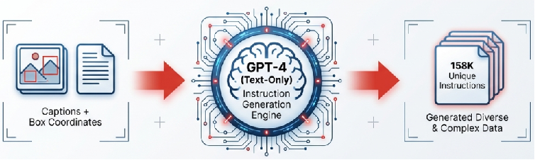 흥미로운 점은 데이터 생성 당시(2023년) GPT-4가 이미지를 직접 볼 수 없는 텍스트 전용 모델이었다는 사실입니다. 연구진은 이미지 파일 대신, 이미지의 캡션과 객체 위치 정보(Bounding Boxes)를 텍스트로 가공해 GPT-4에게 전달했습니다. 그러자 GPT-4는 마치 머릿속으로 이미지를 그려내듯, 주어진 텍스트 메타데이터를 바탕으로 매우 정교하고 논리적인 질문과 답변을 생성해냈습니다.