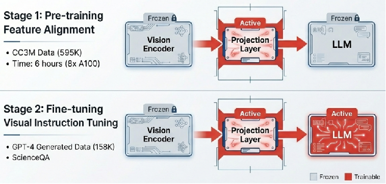 - 1단계 (사전 학습 – Feature Alignment): 시각 인코더와 언어 모델을 고정한 채 오직 투사 레이어만 학습시킵니다. CC3M 데이터셋(595K 쌍)을 사용하여 모달리티 간 정렬을 수행하며, 이는 8장의 A100 GPU로 단 6시간 만에 완료될 정도로 매우 효율적입니다.