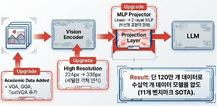 LLaVA-1.5(2023년)는 단순한 업그레이드를 넘어 오픈소스 멀티모달 모델의 실질적인 표준을 제시했습니다. 핵심은 구조적 개선과 데이터의 질적 향상에 있습니다. 기존의 단순 선형 레이어를 비선형 MLP 커넥터로 교체하고 이미지 해상도를 336px로 높여 시각적 이해도를 정교화했습니다.