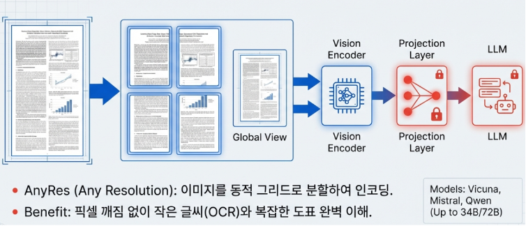 LLaVA-NeXT(v1.6, 2024년)는 기존의 한계를 넘어 상용 모델인 Gemini Pro와 견줄 만큼 강력한 진화를 이뤄냈습니다. 가장 큰 혁신은 ‘AnyRes’ 알고리즘의 도입입니다. 이 기술은 고해상도 이미지를 고정된 크기가 아닌 {2×2, 1×2, 2×1, 1×3, 3×1, 1×4, 4×1} 등 동적 그리드로 유연하게 분할하여 처리합니다. 전체 구도를 파악하는 글로벌 뷰와 세부 패치를 분석하는 로컬 뷰를 결합함으로써, 작은 텍스트를 읽어내는 OCR 능력과 복잡한 도표 분석 성능을 비약적으로 끌어올렸습니다.
