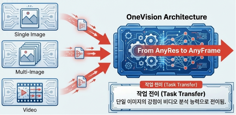 LLaVA-OneVision(2024년)은 단일 이미지, 다중 이미지(Multi-image), 그리고 비디오라는 세 가지 핵심 시나리오를 하나의 모델로 통합하며 오픈소스 멀티모달 모델(LMM)의 새로운 지평을 열었습니다. 이 모델의 가장 큰 혁신은 ‘AnyRes-Max’ 전략을 통해 고해상도 이미지 처리 능력을 극대화한 것과, 이미지에서 학습된 지능을 비디오와 다중 이미지 시나리오로 자연스럽게 전이시키는 Task Transfer 능력에 있습니다.