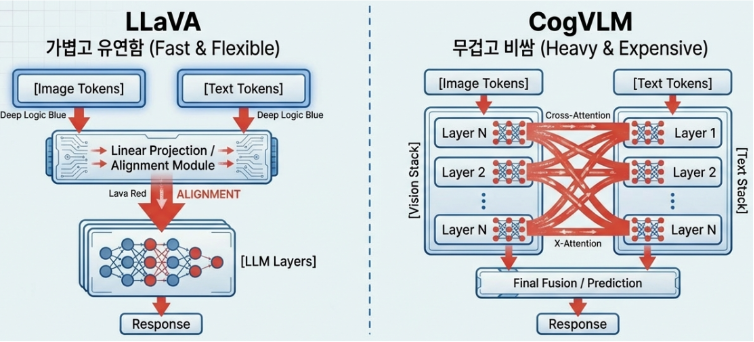 - vs CogVLM (Deep Fusion): CogVLM이 모델 내부에 별도의 ‘시각 전문가’ 모듈을 삽입하는 깊은 융합 방식을 취한다면, LLaVA는 투사 레이어를 통해 정보를 섞는 얕은 정렬(Shallow Alignment)을 선택했습니다. 이는 복잡한 구현 비용을 획기적으로 낮추는 결과로 이어집니다.