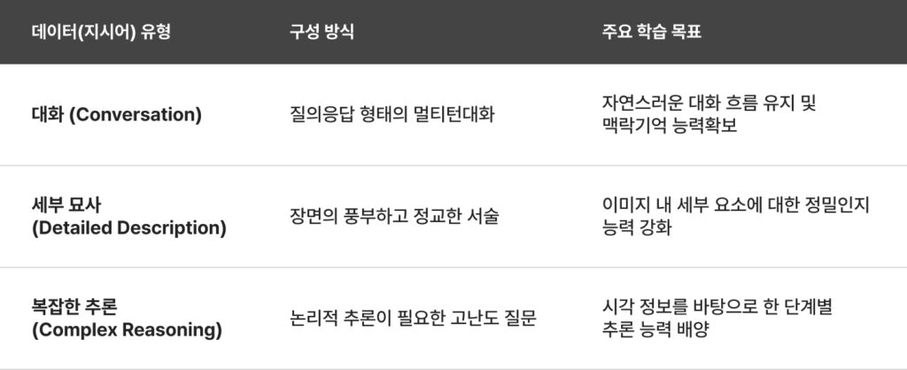 이렇게 탄생한 158K개의 데이터셋은 단순히 눈앞의 사물을 묘사하는 수준을 넘어, 모델에게 다음 세 가지 핵심 역량을 학습시킵니다.