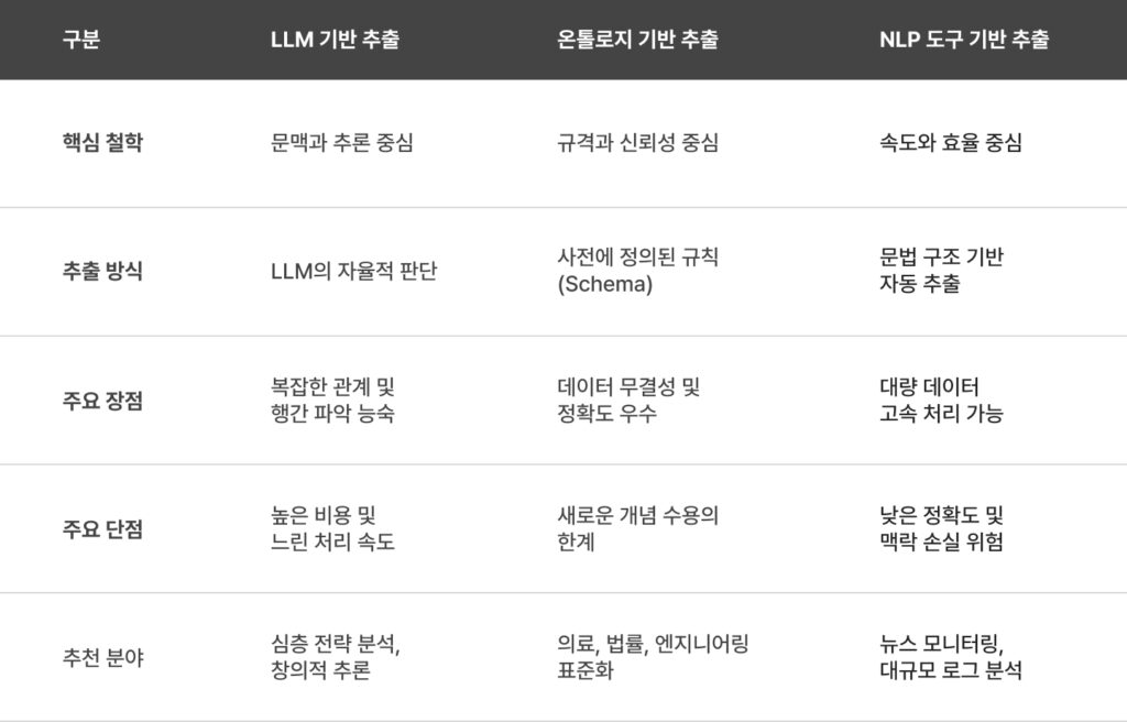 이 방식은 ‘정해진 설계도에 따라 집을 짓는’ 온톨로지 기반 추출입니다. 여기서 ‘온톨로지’란 일종의 데이터 ‘족보’나 엄격한 분류 체계를 뜻하는데요. 쉽게 말해, 정보를 아무렇게나 모으는 게 아니라 미리 약속된 표준 규격과 틀에 맞춰 조립하는 방식입니다.