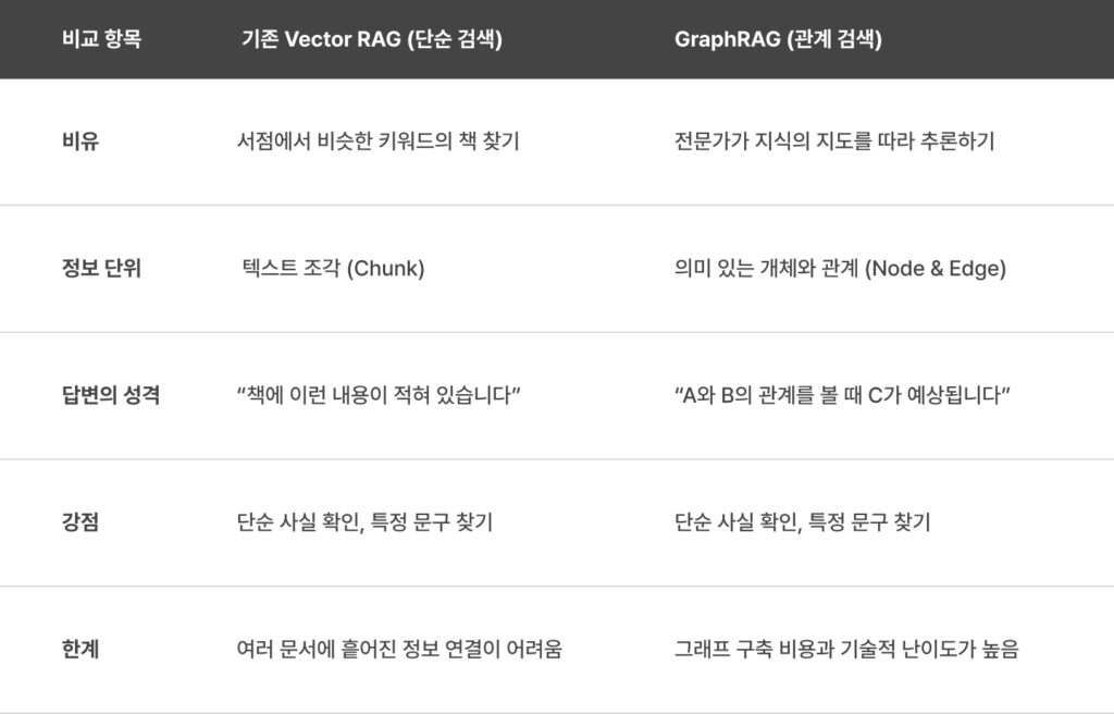 결국, GraphRAG는 단순한 ‘정보 검색’의 영역을 넘어, 흩어진 정보를 엮어 전체를 파악하는 ‘추론’의 영역으로 RAG를 확장시킨 혁신적인 기술입니다. 미로 같은 정보 속에서도 길을 잃지 않고 정확한 정답을 찾아내는 비결이 바로 여기에 있습니다.