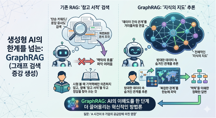 이번 글에서는 단순 검색을 넘어 데이터 속 숨겨진 관계를 추론해내는 GraphRAG의 핵심 원리와, 이것이 왜 AI의 이해도를 한 단계 더 끌어올리는 혁신적인 방법론인지 자세히 풀어서 살펴보겠습니다.