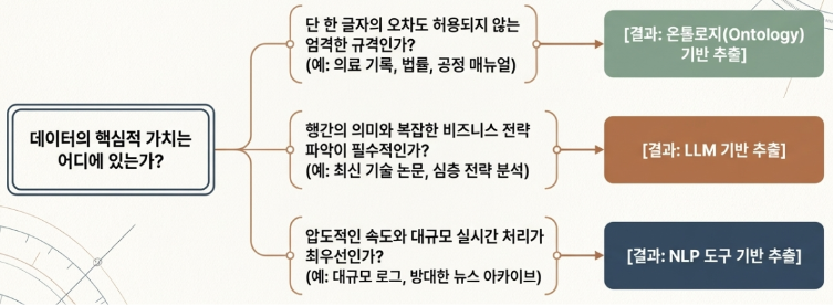 만약 처리해야 할 데이터가 ‘최신 기술 논문이나 복잡한 비즈니스 전략’처럼 맥락이 중요하다면 LLM 기반 방식을 추천합니다. 초기 비용은 다소 발생하더라도 그만큼 정교한 통찰을 얻을 수 있기 때문입니다. 반면, ‘의료 기록이나 제조 공정 매뉴얼’처럼 형식이 엄격하고 단 한 글자의 오차도 허용되지 않는다면 온톨로지 방식이 해답이 됩니다. 단순히 ‘방대한 뉴스 아카이브’를 빠르게 훑으며 트렌드를 파악하고 싶다면 NLP 기반 방식이 가장 경제적이고 효율적인 선택이 될 것입니다.