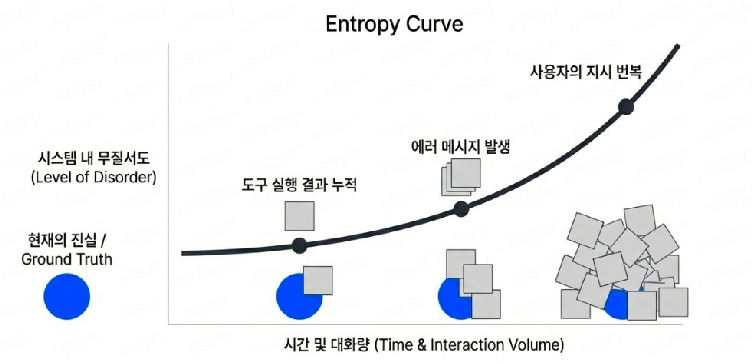최근 업계의 비상한 관심을 끌었던 Anthropic의 ‘Claude Code’ 소스 코드 유출 사건은 우리에게 이 문제에 대한 아주 흥미로운 실마리를 던져주었습니다. 그들의 내부 문서에서 이 현상을 ‘컨텍스트 엔트로피(Context Entropy)’라는 독특한 용어로 정의하고 있었기 때문입니다. 열역학 제2법칙이 말하는 엔트로피처럼, AI와의 대화 세션이라는 고립된 계 내에서도 무질서는 끊임없이 증가합니다. 수많은 도구 실행 결과, 에러 메시지, 사용자의 번복된 지시 사항들이 겹겹이 쌓이면서 무엇이 ‘현재의 진실’인지 판단할 수 없는 혼돈 상태에 이르는 것입니다. 결국 에이전트의 성능 저하는 모델의 지능 문제라기보다, 이 쏟아지는 정보의 쓰레기 더미 속에서 핵심 맥락을 골라내지 못하는 ‘관리의 실패’에 가깝습니다.