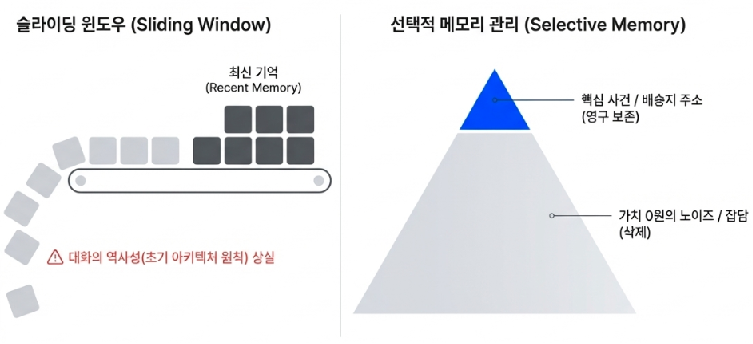 게임 NPC 대화 시스템이 플레이어와의 수많은 대화 중 “누구를 구하기로 선택했는가”라는 핵심 분기점은 영구 장기 기억에 새기되, 그 과정에서 나눈 시시콜콜한 농담은 과감히 삭제하는 것과 같은 이치입니다. 챗봇은 대화 세션이 길어지면 최근의 메시지만 활성 메모리에 남기고, 나머지는 핵심 사건(Event) 위주의 요약본으로 대체하여 컨텍스트의 순도를 유지합니다. 이처럼 ‘현명하게 잊는 법’을 배운 AI만이 수천 번의 대화 턴(Turn) 속에서도 길을 잃지 않고 프로젝트의 목표 지점을 향해 묵묵히 걸어갈 수 있습니다. 결국 삭제의 미학이란, 정보의 양을 줄이는 기술이 아니라 정보의 질을 지켜내는 처절한 사투인 셈입니다.