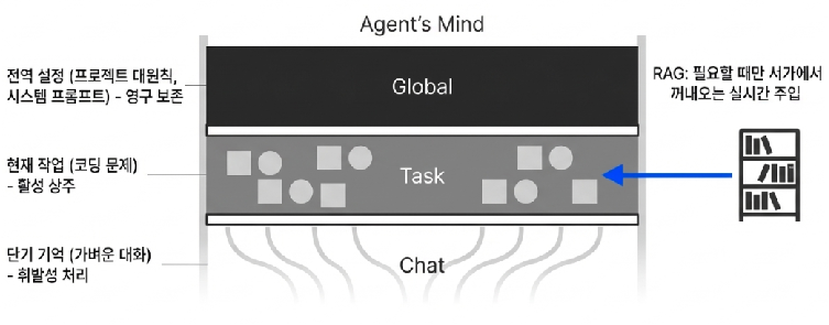이러한 한계를 돌파하기 위해 최근 업계가 주목하는 기법이 바로 ‘계층적 컨텍스트 구조화’와 RAG의 결합입니다. 이는 정보를 ‘전역 설정(Global)’, ‘현재 작업(Task)’, ‘단기 기억(Chat)’으로 층위(Layer)를 나누어 관리하는 매우 정교한 집 구조를 설계하는 것입니다. 프로젝트의 대원칙이나 시스템 프롬프트는 최상단에 고정하여 절대 잊지 않게 하고(Global), 현재 풀고 있는 구체적인 코딩 문제는 작업 메모리에 상주시키며(Task), 방금 나눈 가벼운 대화는 휘발성 메모리(Chat)에서 처리합니다.