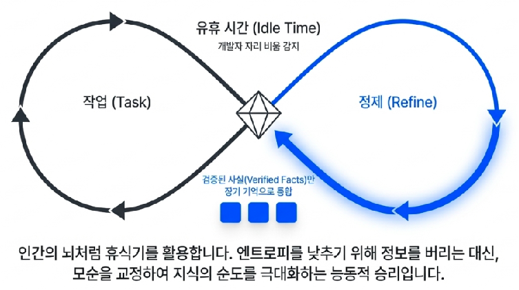 단순히 줄이는 것이 목적이 아닙니다. 대화 중에 발생했던 논리적 모순을 찾아내어 교정하고, “아마 이 함수에 문제가 있을 것 같다”는 모호한 추측성 대화들을 실제 코드베이스와 대조하여 “이 함수는 특정 조건에서 에러를 발생시킴”이라는 ‘검증된 사실’로 재구조화합니다. 이는 엔트로피를 낮추기 위해 정보의 정밀도를 희생하던 과거의 방식과 정반대입니다. 오히려 유휴 시간을 활용해 정보의 순도를 높임으로써, 사용자가 다시 터미널 앞에 앉았을 때 에이전트가 가장 깨끗하고 강력한 지식의 정수를 보유하게 만드는 ‘능동적 승리’인 셈입니다.