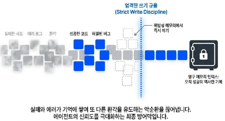 여기에 더해, 성공한 결과물만을 메모리 인덱스에 기록하는 ‘엄격한 쓰기 규율’은 컨텍스트의 오염을 원천 차단합니다. 실패한 시도나 에러 메시지가 메모리에 쌓여 환각을 유도하는 것을 막고, 오직 ‘성공의 역사’만을 기록하여 에이전트의 신뢰도를 극대화합니다.