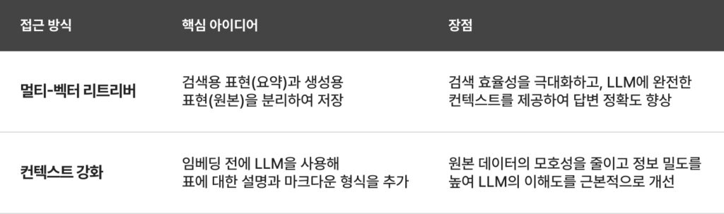 이 접근법은 검색 효율성과 답변의 정확도를 동시에 높입니다. 요약본을 임베딩함으로써 “노이즈가 많은 임베딩” 문제를 해결하고, 생성 단계에서는 원본 데이터를 제공하여 LLM이 정확하고 상세한 답변을 만들 수 있도록 지원합니다. 이 접근법은 테이블의 크기가 매우 크고 내용이 복잡하여 전체를 임베딩할 경우 심각한 노이즈가 발생하는 금융 보고서나 과학 연구 데이터 처리에 특히 효과적입니다.