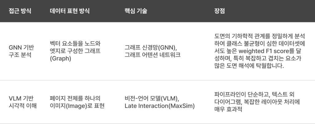 - CAD 도면 처리 기술은 GNN을 통해 ‘심층적인 구조적 분석’을 수행하는 접근법과, VLM을 통해 ‘단순화된 시각적 이해’를 추구하는 접근법 사이의 선택으로 귀결됩니다.