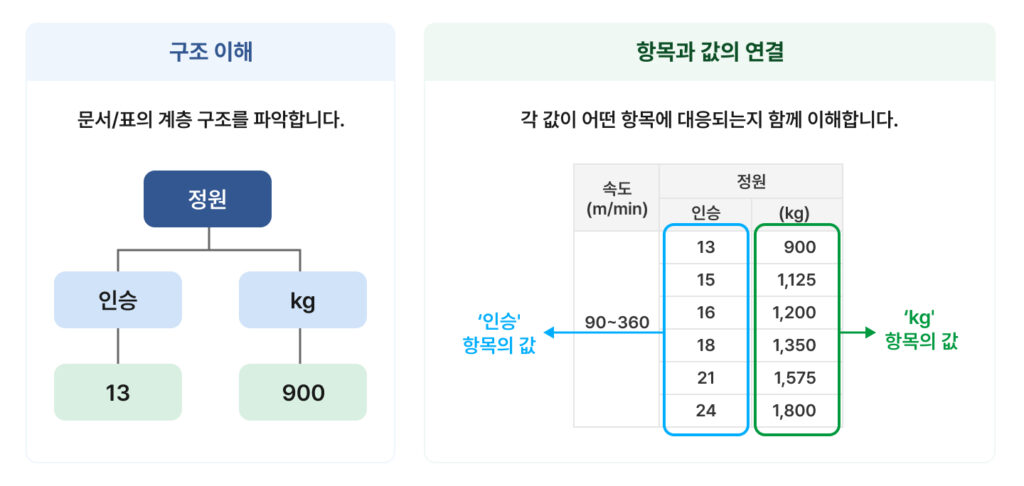 시방서의 핵심 정보는 대부분 표(Table) 안에 담겨 있습니다. 하지만 승강기의 ‘용량(Capacity)’ 스펙을 예로 들어보면, 대부분의 시방서에는 “용량: 900kg”이라고 친절하게 적혀 있는 경우는 드뭅니다. 대신 ‘정원’이라는 상위 항목 아래, ‘인승’과 ‘kg’이라는 하위 항목이 나뉘어 있고, 그 아래에 각각 ‘13’과 ‘900’이라는 값이 대응되는 복합적인 구조를 취합니다.
