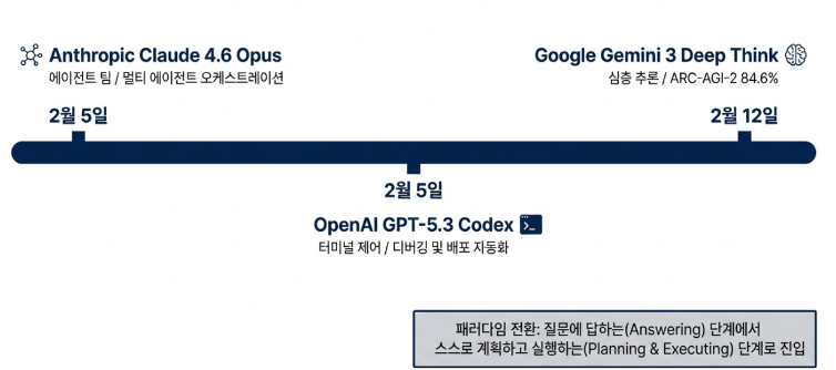 2026년 2월, AI 산업은 단순한 성능 개선을 넘어 거대한 패러다임 전환의 시기를 맞이했습니다. 그 신호탄은 2월 5일, Anthropic의 Claude 4.6 Opus와 OpenAI의 GPT-5.3 Codex가 불과 몇 분 차이로 연달아 공개된 사건이었습니다. 이어서 이를 능가한다고 평가받는 Google의 Gemini 3 Deep Think 업그레이드 버전이 2월 12일 발표되며 변화의 흐름은 더욱 가속화되었습니다.
