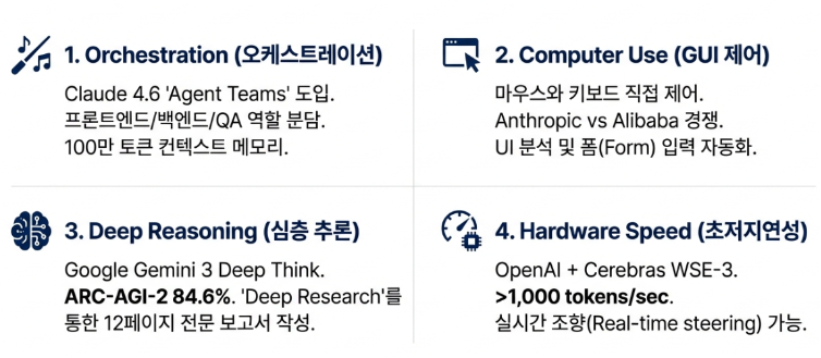 가장 먼저 눈에 띄는 변화는 단일 AI가 모든 짐을 짊어지던 시대가 끝나고, 여러 에이전트가 팀을 이뤄 유기적으로 일하는 ‘자율적 협업 및 다중 에이전트 오케스트레이션’의 등장입니다. 앤스로픽(Anthropic)은 Claude 4.6에 하위 에이전트들에게 프론트엔드, 백엔드, QA 등 역할을 나누어 병렬로 처리하게 하는 ‘에이전트 팀’ 기능을 도입했습니다. 100만 토큰에 달하는 방대한 기억력을 바탕으로 장기 프로젝트에서도 에이전트끼리 코드를 검토하고 조정하는 끈기를 보여줍니다. 오픈AI(OpenAI) 역시 GPT-5.3 Codex를 단순 코딩 도구가 아닌 터미널 환경을 완벽히 제어하는 자율적인 소프트웨어 엔지니어로 진화시켰습니다. 스스로 훈련 과정을 디버깅하고 배포까지 관리하며, 사용자는 직접 코딩할 필요 없이 ‘커맨드 센터’에서 여러 에이전트를 실시간으로 지휘하기만 하면 됩니다.