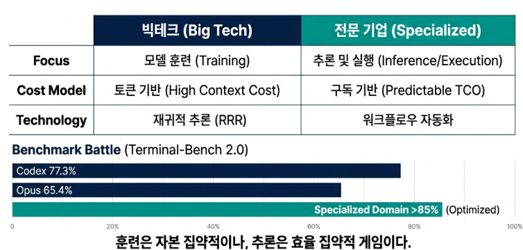 [분석 결과] 훈련 시장은 거대 자본을 앞세운 빅테크가 주도하고 있으나, 실제 볼륨 게임인 추론(Inference) 시장에서는 효율 중심의 에이전틱 기술과 비용 최적화 능력이 시장 점유율을 결정하는 진정한 승부처가 될 것입니다.