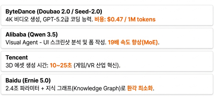 이러한 흐름을 이어받아 2026년 2월, 틱톡의 모회사 바이트댄스(ByteDance)는 ‘Doubao 2.0 (Seed-2.0)’을 전격 출시하며 본격적인 ‘에이전트 시대’의 개막을 선언했습니다. 텍스트, 이미지, 비디오를 하나의 공간에서 처리하는 혁신적인 구조를 채택해 GPT-5.2나 Gemini 3 Pro에 필적하는 최고 수준의 수학 및 코딩 능력을 확보했습니다. 무엇보다 놀라운 것은 비용입니다. 100만 토큰당 약 0.47달러라는 상상 초월의 가격을 제시하며, 대규모 AI 에이전트를 운영할 때 발생하는 기업들의 비용 부담을 완벽하게 부숴버렸습니다. 함께 공개된 Seedance 2.0은 텍스트 명령만으로 4K 비디오를 생성하고 편집해 내며 일론 머스크의 찬사를 이끌어내기도 했습니다.