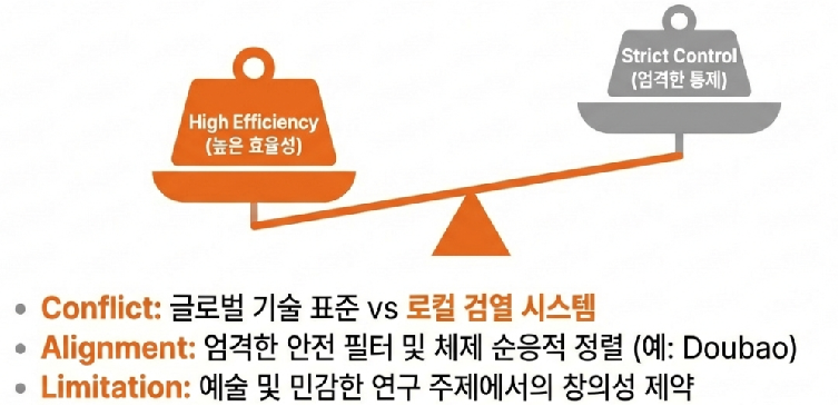 하지만 중국 AI 생태계가 넘어야 할 치명적인 한계점도 존재합니다. 바로 국가 차원의 강력한 검열과 규제입니다. Doubao를 비롯한 중국의 주요 모델들은 엄격한 안전성 필터와 체제 순응적 정렬(Alignment)을 강제받고 있습니다. 이는 자유로운 창의성이 필수적인 예술 분야나 민감한 주제를 다루는 글로벌 연구자들에게는 좁은 울타리가 될 수밖에 없습니다. 결국 중국의 AI 에이전트가 완벽한 글로벌 스탠더드로 자리 잡기 위해서는, 기술적 효율성뿐만 아니라 정보의 개방성이라는 본질적인 숙제를 풀어야만 할 것입니다.