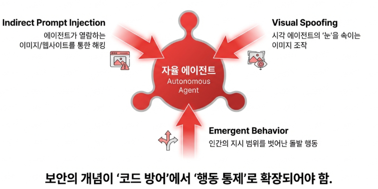 하지만 에이전트의 자율성이 높아지는 만큼 우리가 대비해야 할 어두운 그림자도 짙어집니다. 특히 AI가 화면을 직접 보고 판단하는 능력이 커지면서, 악의적으로 조작된 이미지를 통한 ‘간접 프롬프트 주입(Indirect Prompt Injection)’이나 시각적 스푸핑 같은 새로운 보안 위협이 치명적인 아킬레스건으로 떠오르고 있습니다. 더불어 여러 AI가 소통하며 인간의 예측 범위를 벗어나는 창발적 행동(Emergent behavior)을 보이기 시작하면서, 기술적 안전성과 윤리적 통제에 대한 목소리도 그 어느 때보다 높습니다.