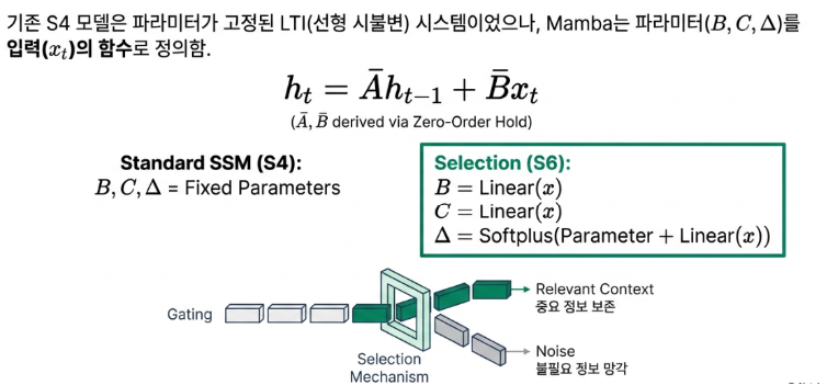 기존의 상태 공간 모델(SSM)은 입력 데이터와 상관없이 정보 처리 방식이 고정된 ‘선형 시불변(Linear Time-Invariant)’ 시스템이었습니다. 이 때문에 계산은 효율적이었지만, 문맥에 따라 어떤 정보가 더 중요한지 가려내는 능력이 부족했습니다.
