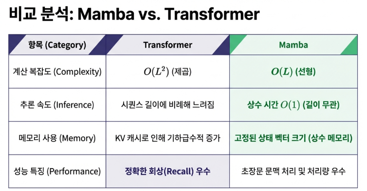 이 거대한 벽을 허물기 위해, 2023년 말 카네기 멜런 대학교의 Albert Gu와 Flash-Attention을 개발을 주도했던 프린스턴 대학교의 Tri Dao의 공동 연구로 발표된Mamba(Linear-Time Sequence Modeling with Selective State Spaces)라는 혁신적인 아키텍처가 등장했습니다. Mamba는 트랜스포머의 성능은 유지하면서도 계산 복잡도를 선형(O(L))으로 낮추며 AI의 새로운 패러다임을 제시했습니다.