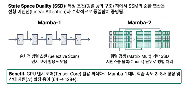 이는 트랜스포머와 Mamba가 서로 다른 아키텍처가 아니라, 동일한 선형 변환을 하나는 직접적인 위치 간 상호작용(어텐션)으로, 다른 하나는 재귀적 상태 업데이트(SSM)로 계산하는 것임을 의미한다.