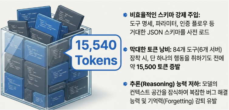 이처럼 강력한 범용성과 보안성을 지녔음에도 불구하고, 실제 프로덕션 환경에서 마주하는 아주 뚜렷한 기술적 한계가 존재합니다. 가장 대표적인 문제는 이른바 ‘컨텍스트 비만(Context Bloat)’ 현상입니다.