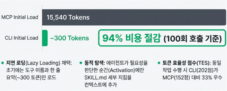 CLI 방식은 시작부터 모든 설명서를 억지로 주입하지 않습니다. 업무 시작 시 SKILL.md 파일에서 스킬 이름과 짧은 요약(약 90토큰)만 가볍게 훑어보고, 특정 도구가 진짜 필요한 순간에만 –help 명령어나 세부 지침을 동적으로 읽어옵니다. 이 ‘점진적 정보 노출(Progressive Disclosure)’ 덕분에 84개 도구 기준 MCP가 15,500토큰을 낭비할 때, CLI는 단 300토큰으로 구동됩니다. 아낀 95%의 뇌 용량을 온전히 ‘추론’에 쏟아부을 수 있습니다.