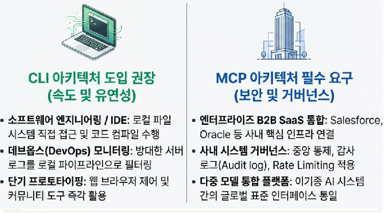 실제 2026년 엔터프라이즈 AI 통합의 새로운 표준은 이 둘을 융합한 하이브리드 아키텍처로 굳어지고 있습니다. 기업의 민감한 데이터는 ‘MCP 게이트웨이’를 통해 철통 보안 속에서 공급받고, 에이전트가 로직을 수행하는 과정은 가볍고 날렵한 터미널 환경의 ‘스킬(CLI)’을 통해 통제하는 것입니다. 결국 지켜야 할 곳에는 철벽(MCP)을 두르고 달려야 할 곳에는 무한한 자유(CLI)를 허락하는 정교한 설계가 에이전트의 잠재력을 100% 끌어냅니다.