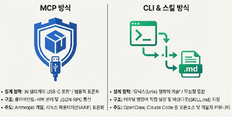 - CLI와 스킬 (Skill): 에이전트가 터미널에서 직접 명령어를 치는 구조입니다. 필요할 때만 지침을 불러오는 ‘압도적 토큰 효율성’과 통합 비용 제로가 최대 무기입니다. 반면, 로컬 권한 직접 실행으로 인한 ‘보안 취약성’이 커서 샌드박스 인프라 구축이 필수적입니다.