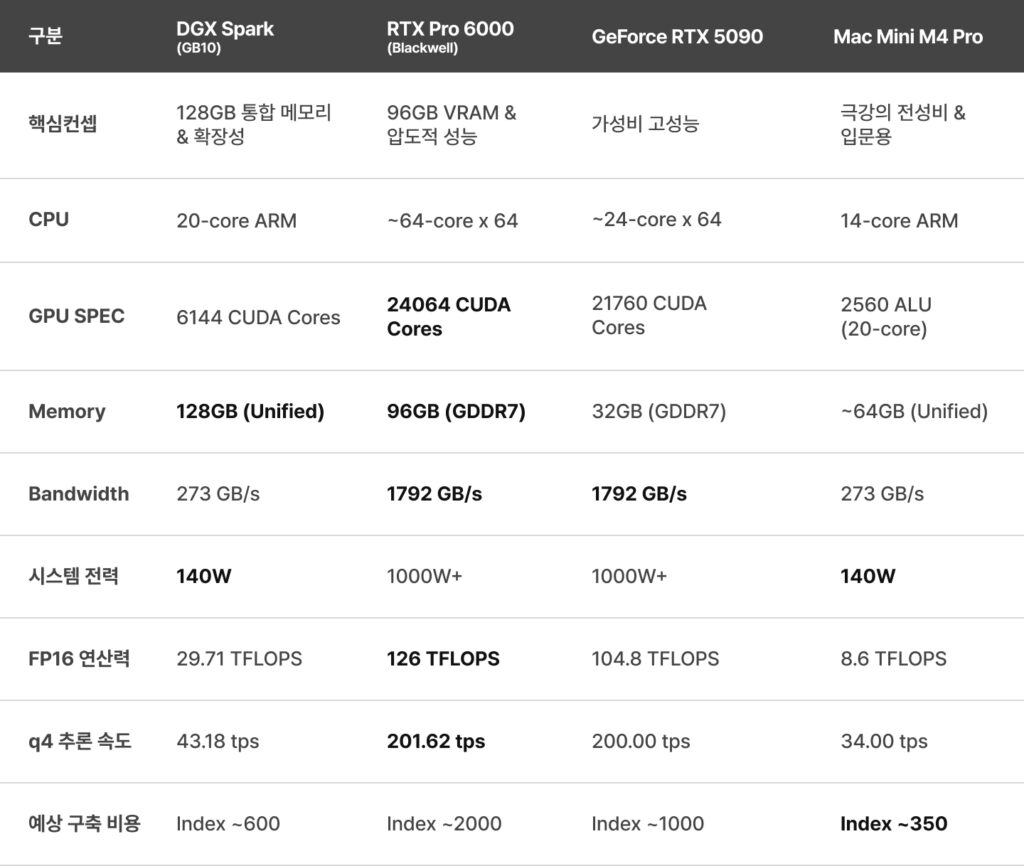 최근 공개된 벤치마크 데이터와 스펙을 바탕으로, 현재 시장에서 주목받는 4가지 선택지(NVIDIA DGX Spark, RTX Pro 6000, RTX 5090, Mac Mini M4 Pro)를 실제 LLM 밴치마크를 기반으로 비교 분석해보겠습니다.