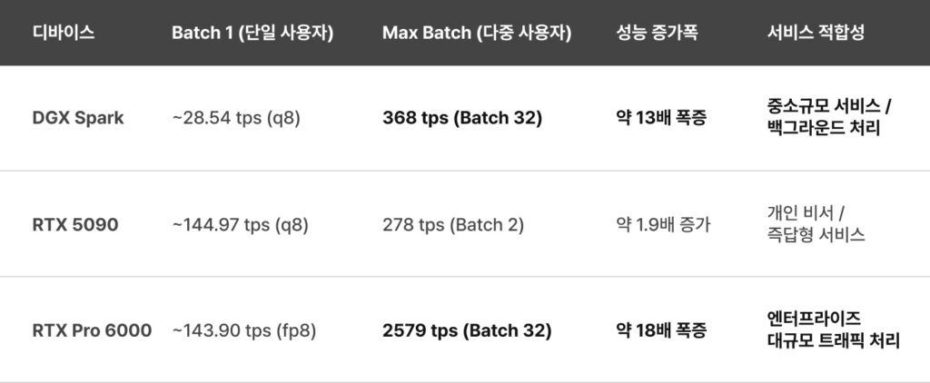 배치 2에서 278 tps를 기록했지만, VRAM 용량 부족으로 인해 배치 사이즈를 크게 늘리기 어렵습니다. (배치를 늘리려면 KV Cache를 위한 막대한 VRAM이 추가로 필요하기 때문). 따라서 1~2인용 고성능 비서 또는 소규모 작업 역할에 국한됩니다.