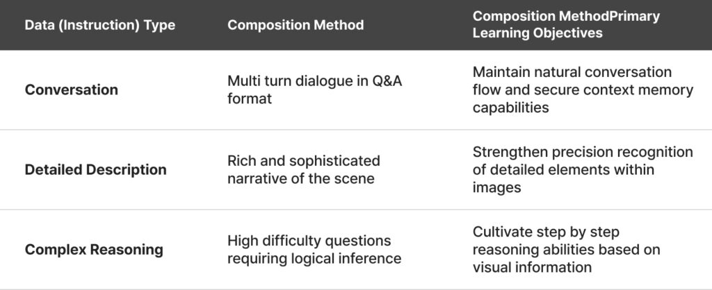 An interesting fact is that during the data generation phase in 2023, GPT-4 was a text-only model that could not directly see images. The researchers converted image captions and object bounding box coordinates into text metadata and fed them to GPT-4. Consequently, GPT-4 generated sophisticated and logical questions and answers based on this metadata as if it were visualizing the scene in its mind.