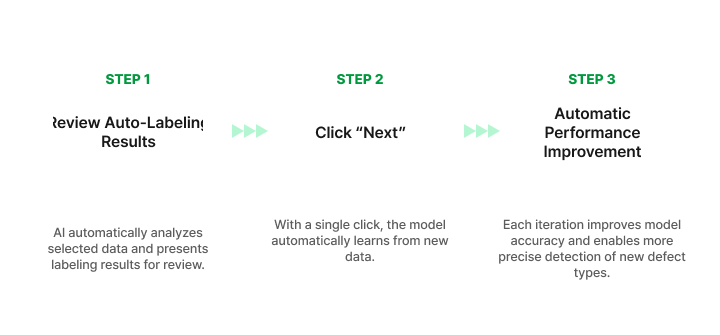 NAVI AI Pro fundamentally solves this problem. The newly added ‘Continual Learning’ feature effectively leverages the weights of the existing model to quickly incorporate new data and defect types.