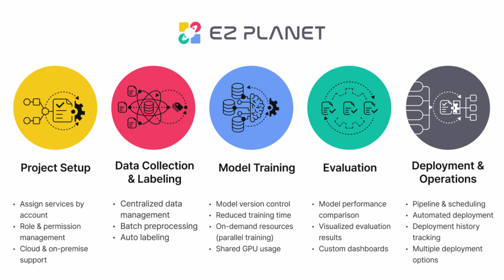 Thanks to these features, EZ PLANET efficiently automates the operation and synchronization of the entire machine learning lifecycle, maximizing productivity and minimizing errors.