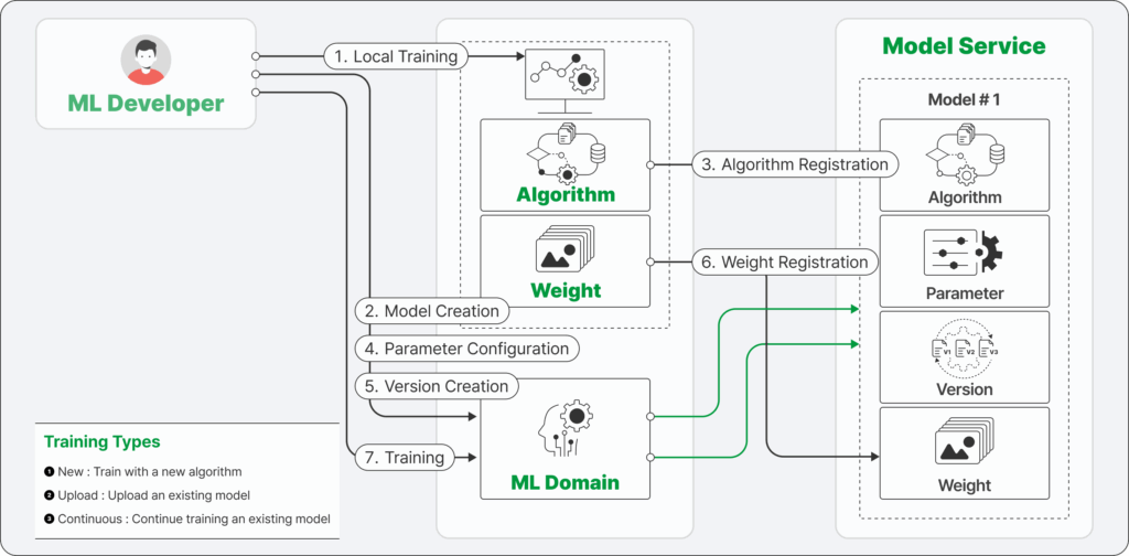 - Supporting the easy deployment of trained models as APIs and enabling them to be served in various environments (Cloud, On-premise).