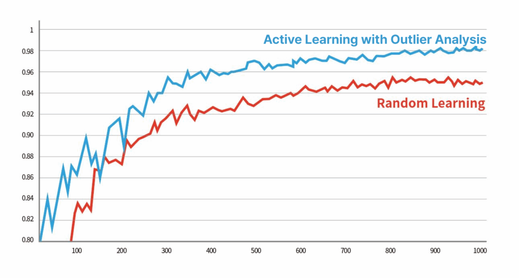 - Furthermore, you can quickly and easily reach your target performance by generating an initial training model with a small amount of data, and then performing additional training by re-verifying only the low-confidence data and labeling information. Especially for Object Detection and Segmentation, it uses not only simple classification information but also localization information as a criterion for data discrimination, selecting meaningful data with greater precision. Consequently, this drastically reduces unnecessary data collection and labeling efforts, significantly lowering the overall development cost.