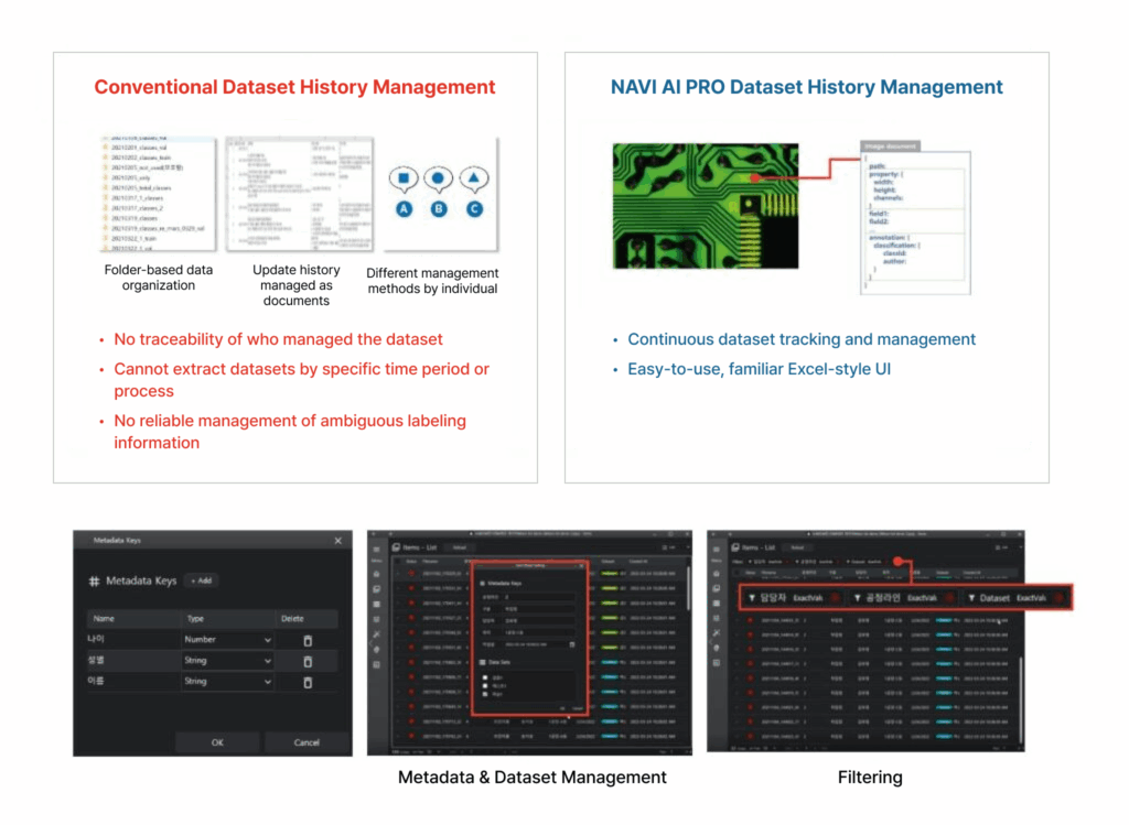 Data isn’t just used once and discarded; it can be systematically managed and continuously reused. Filtering, classification, and history management are all handled automatically. The convenient Excel-like Metadata function allows supplementary information to be stored alongside the training data, making history management easy and practical. You can easily set up datasets using the metadata filtering feature.