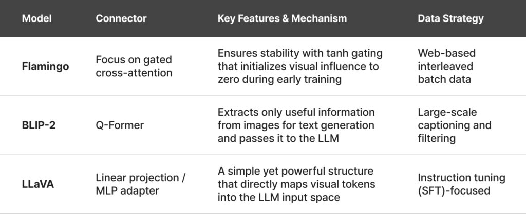 LLaVA popularized the Linear Projection method, which is both simple and powerful. In the LLaVA architecture, visual feature vectors from CLIP are mapped directly into the LLM’s input token embedding space through a simple linear layer or a two-layer MLP. These converted visual tokens are arranged alongside text tokens and fed into the LLM, which processes them as a standard text sequence. LLaVA 1.5 and LLaVA-NeXT further improved performance by introducing techniques to divide high-resolution images into multiple tiles, drastically enhancing OCR and precise visual reasoning capabilities.