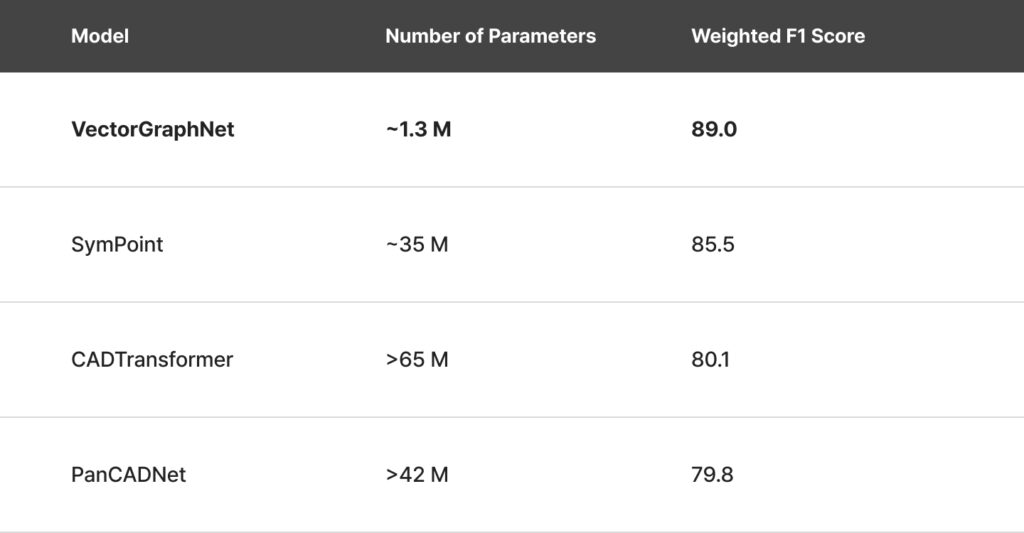 The number of parameters determining the model size of VectorGraphNet is only about 1.3 million (1.3M). This is a mere fraction of competitor models such as PanCADNet (over 42M) or CADTransformer (over 65M). This remarkable efficiency enables high-speed inference even in environments without high-end GPUs. - Quantitative Performance: Outperforming Competitors